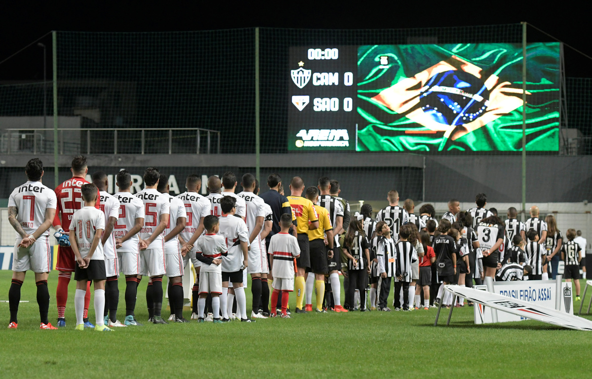 Soccer Football - Brasileiro Championship - Atletico Mineiro v Sao Paulo - Raimundo Sampaio Stadium, Belo Horizonte, Brazil - June 13, 2019 Teams line up during the national anthem before the match REUTERS/Washington Alves