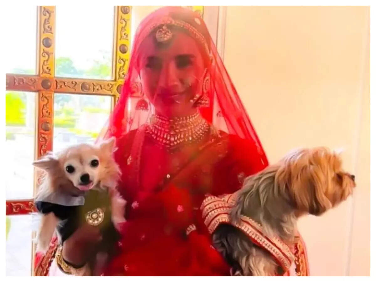 Dressed in a red bridal outfit with heavy kundan jewellery and a long veil, Patralekhaa is seen striking a pose for the camera with two dogs in her arms. The actress was all smiles for the picture.