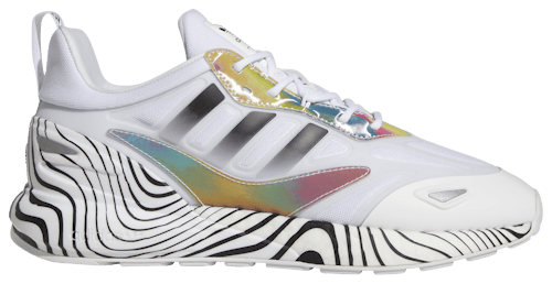 Adidas has done up the ZX 2K Boost 2.0 in an eye-catching color scheme to match Mahomes’ style of play. A hypnotic spiral print envelops the midsole and climbs up the heel, while a holographic rainbow on the upper’s paneling brings a dash of color to the black and white sneaker. Tucked between the dynamic prism are Adidas’ three stripes, which are rendered in a black-to-white gradient for even more character.