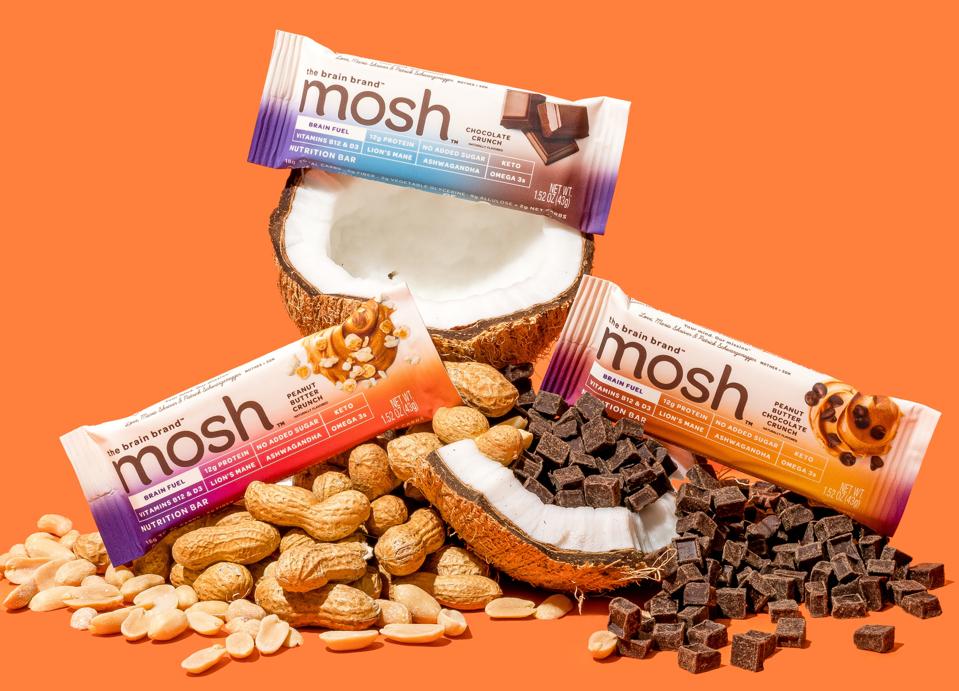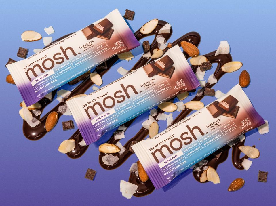 Starting with a line of snack bars enriched with 12 grams of protein each and superfoods, including lion’s mane, ashwagandha, omega-3s, and made without added sugar, MOSH is currently selling three different varieties online through its website: Chocolate Crunch, Peanut Butter Crunch, and Peanut Butter Chocolate Crunch.