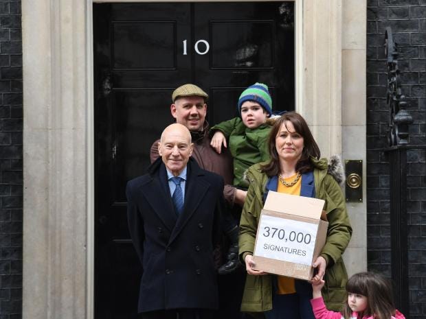 Actor Sir Patrick Stewart joined a six-year-old boy with epilepsy on the steps of 10 Downing Street, to hand over a petition containing nearly 400,000 signatures which calls on the Government to approve a license for medical cannabis.