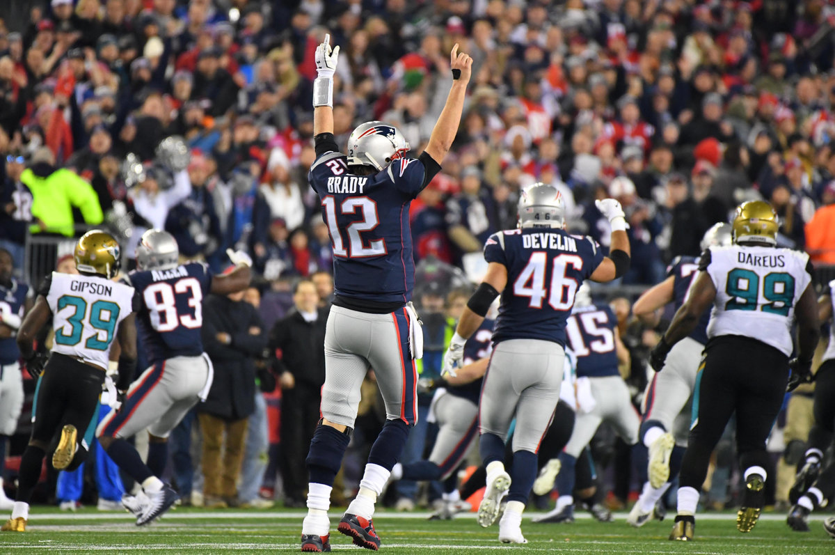 Jan 21, 2018; Foxborough, MA, USA; New England Patriots quarterback Tom Brady (12) celebrates after a first down by running back Dion Lewis (33) picks up a first down in the fourth quarter in the AFC Championship Game against the Jacksonville Jaguars at Gillette Stadium. Mandatory Credit: Robert Deutsch-USA TODAY Sports
