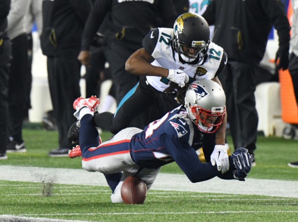 Jan 21, 2018; Foxborough, MA, USA; New England Patriots cornerback Stephon Gilmore (24) breaks up a pass to Jacksonville Jaguars wide receiver Dede Westbrook (12) during the fourth quarter in the AFC Championship Game at Gillette Stadium. Mandatory Credit: Robert Deutsch-USA TODAY Sports