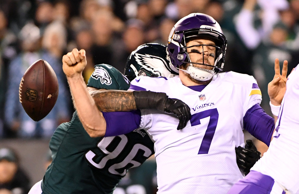 Jan 21, 2018; Philadelphia, PA, USA; Philadelphia Eagles defensive end Derek Barnett (96) causes Minnesota Vikings quarterback Case Keenum (7) to fumble during the second quarter in the NFC Championship game at Lincoln Financial Field. Mandatory Credit: Eric Hartline-USA TODAY Sports
