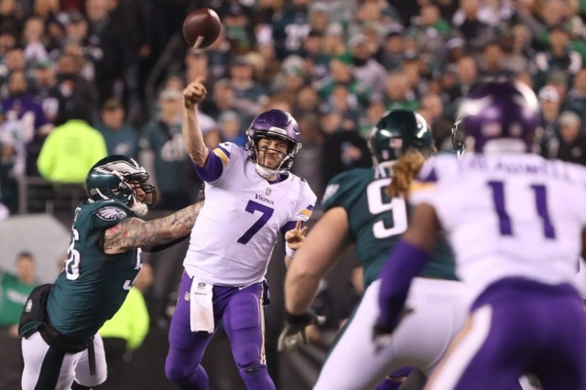 Jan 21, 2018; Philadelphia, PA, USA; Minnesota Vikings quarterback Case Keenum (7) runs with the ball as Philadelphia Eagles defensive end Vinny Curry (75) chases during the second half during the NFC Championship game at Lincoln Financial Field. Mandatory Credit: Geoff Burke-USA TODAY Sports