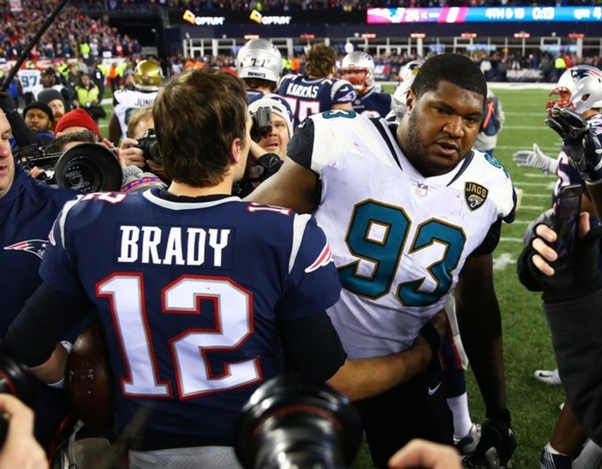 Jan 21, 2018; Philadelphia, PA, USA; Philadelphia Eagles quarterback Nick Foles (9) celebrates as Eagles owner Jeff Lurie (R) looks on after defeating the Minnesota Vikings during the NFC Championship game at Lincoln Financial Field. Mandatory Credit: Geoff Burke-USA TODAY SportsJan 21, 2018; Philadelphia, PA, USA; Minnesota Vikings quarterback Case Keenum (7) throws the ball as Philadelphia Eagles defensive end Chris Long (56) defends in the fourth quarter during the NFC Championship game at Lincoln Financial Field. Mandatory Credit: Bill Streicher-USA TODAY SportsJan 21, 2018; Foxborough, MA, USA; New England Patriots wide receiver Danny Amendola (80) celebrates with quarterback Tom Brady (12) after catching a touchdown pass against the Jacksonville Jaguars during the fourth quarter in the AFC Championship Game at Gillette Stadium. Mandatory Credit: Mark J. Rebilas-USA TODAY SportsJan 21, 2018; Foxborough, MA, USA; New England Patriots quarterback Tom Brady (12) greets Jacksonville Jaguars defensive end Calais Campbell (93) following the AFC Championship at Gillette Stadium. Mandatory Credit: Mark J. Rebilas-USA TODAY SportsJan 21, 2018; Foxborough, MA, USA; New England Patriots wide receiver Danny Amendola (80) celebrates his touchdown with wide receiver Chris Hogan (15) during the fourth quarter against the Jacksonville Jaguars in the AFC Championship Game at Gillette Stadium. Mandatory Credit: Greg M. Cooper-USA TODAY Sports