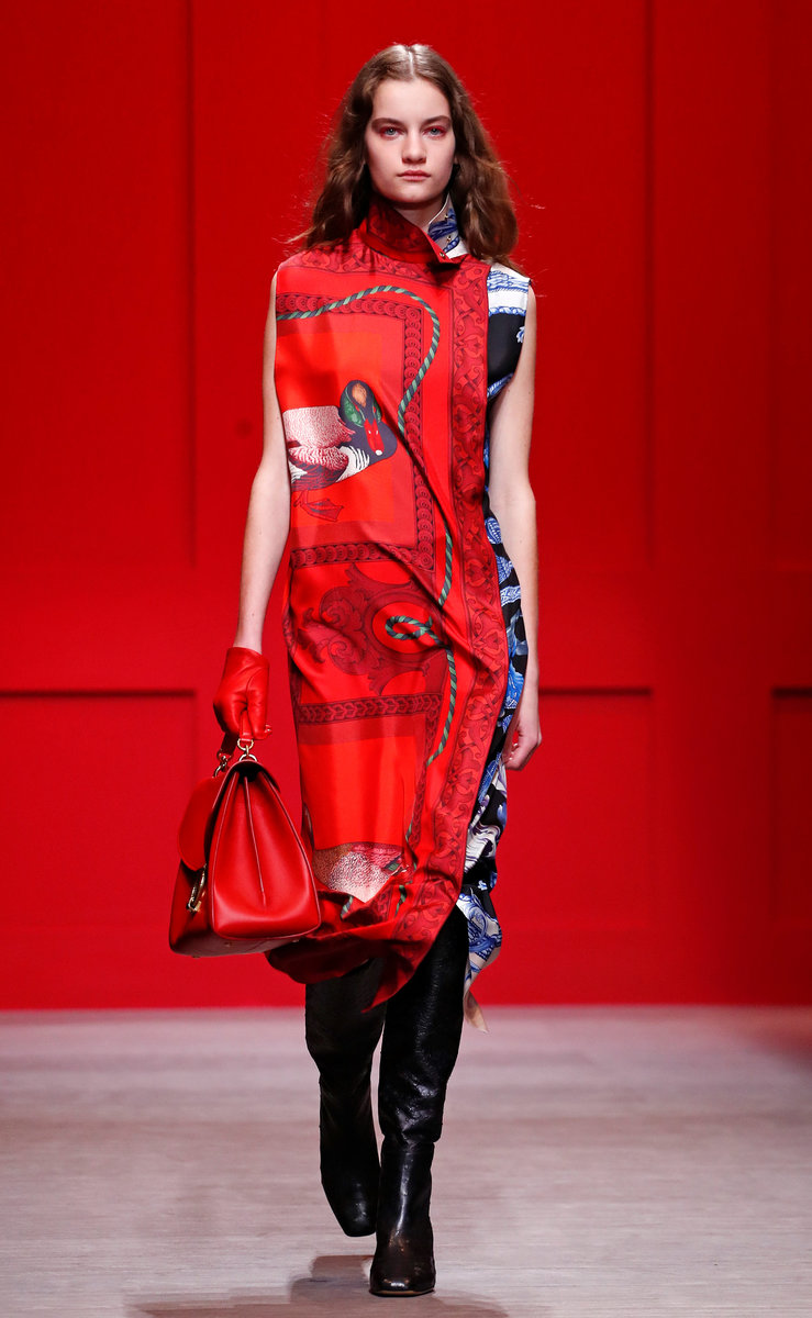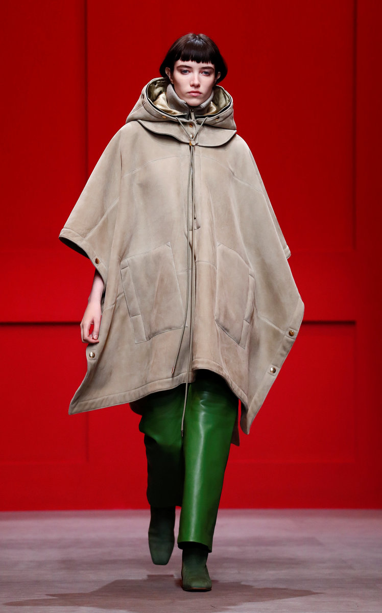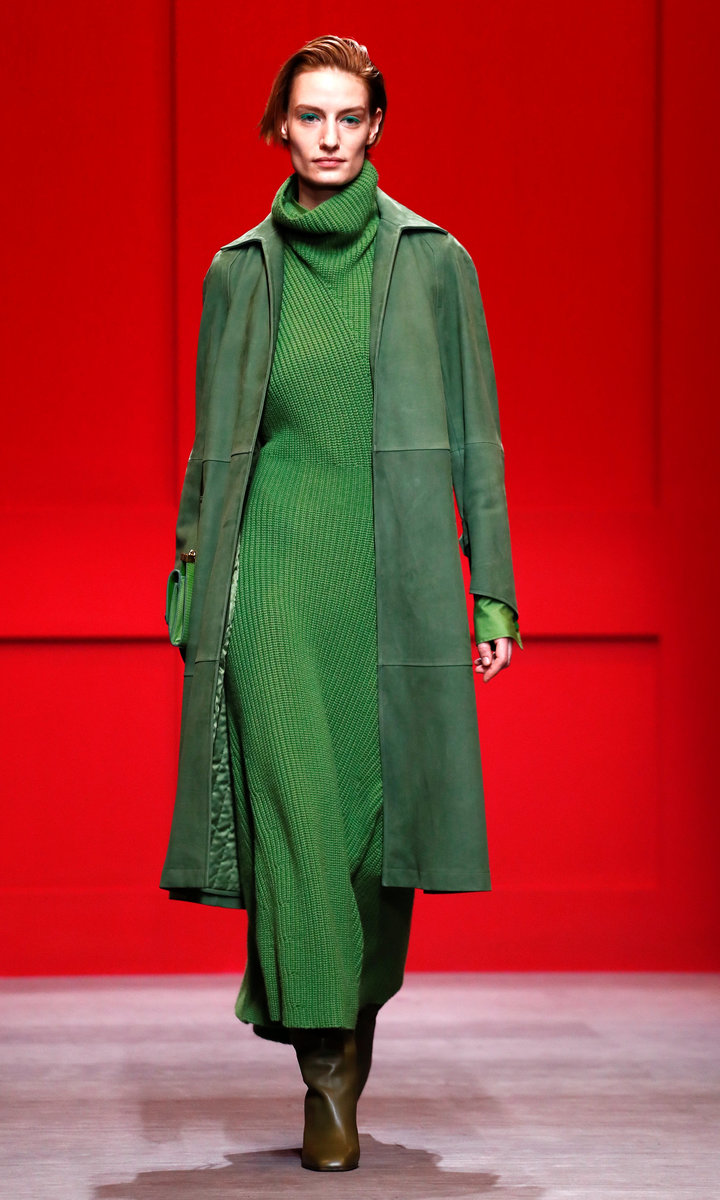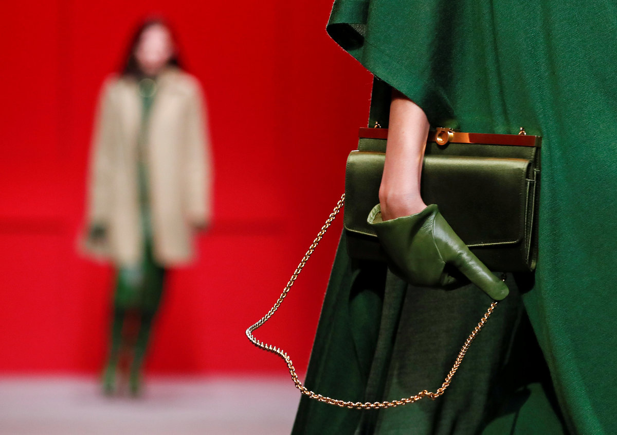 The collection, combining women's designs with those by the group's menswear designer Guillaume Meilland, used plush leather, wool and rich silk, to showcase Italian craftsmanship.