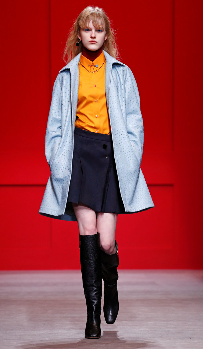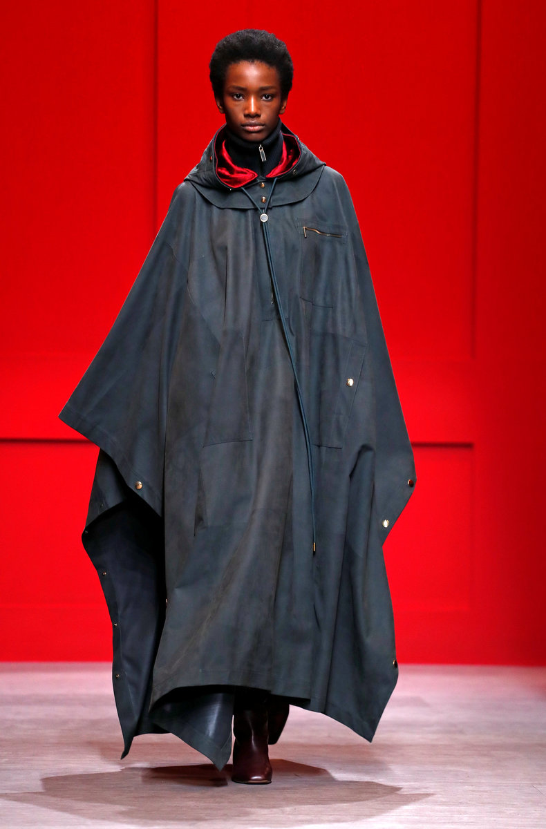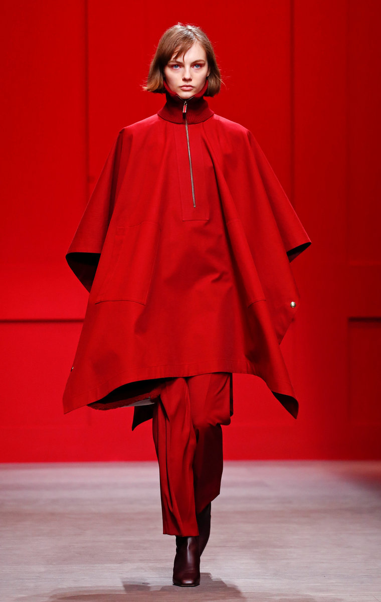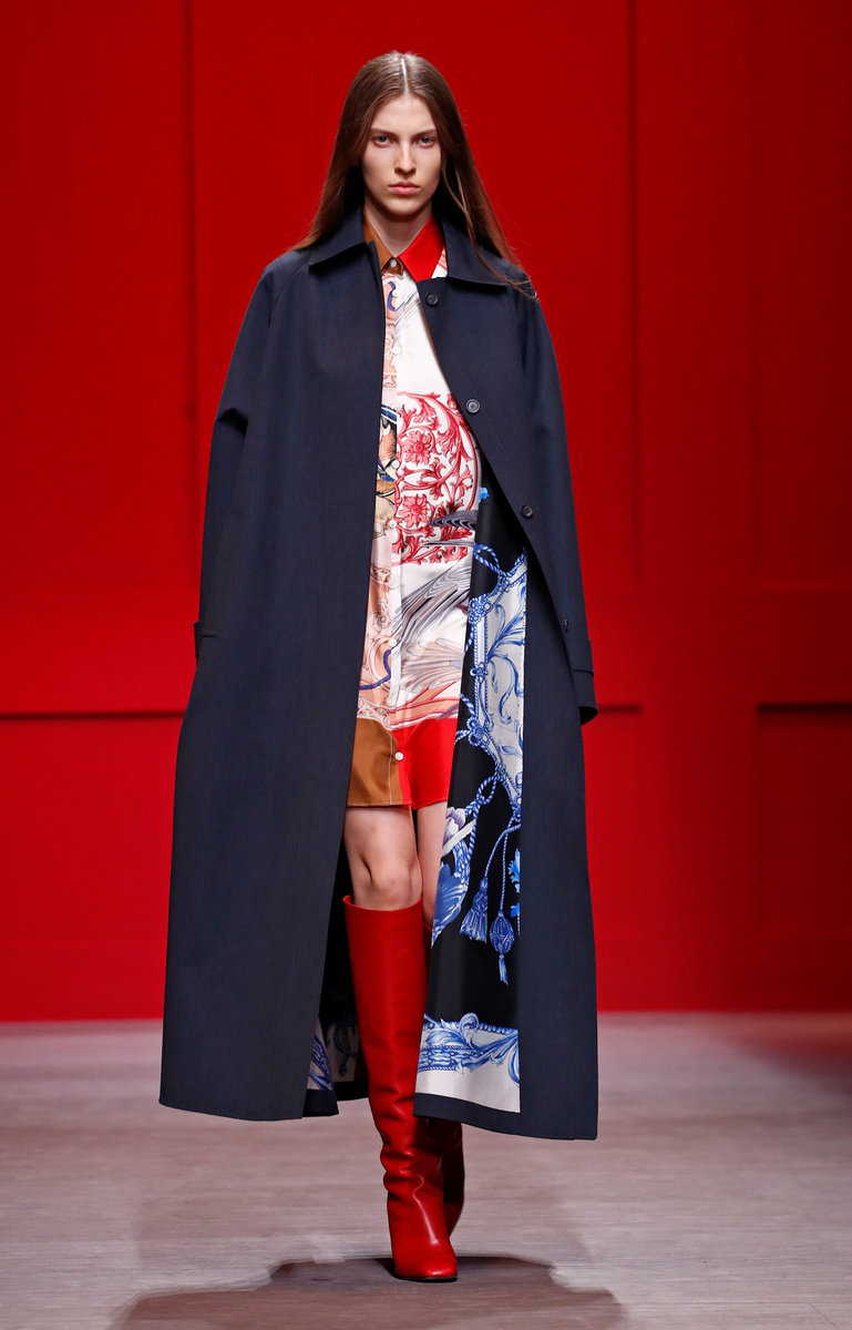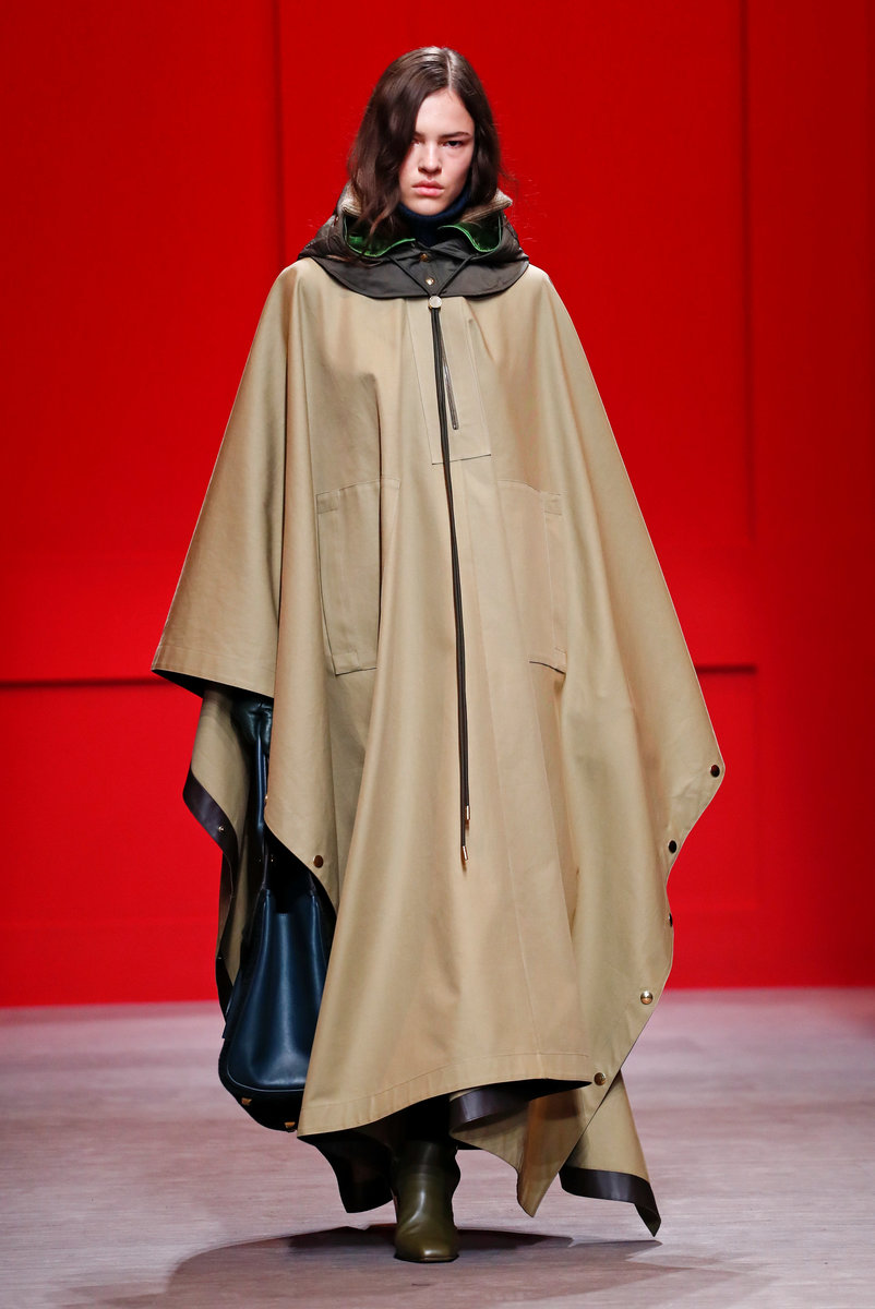 The collection, combining women's designs with those by the group's menswear designer Guillaume Meilland, used plush leather, wool and rich silk, to showcase Italian craftsmanship.