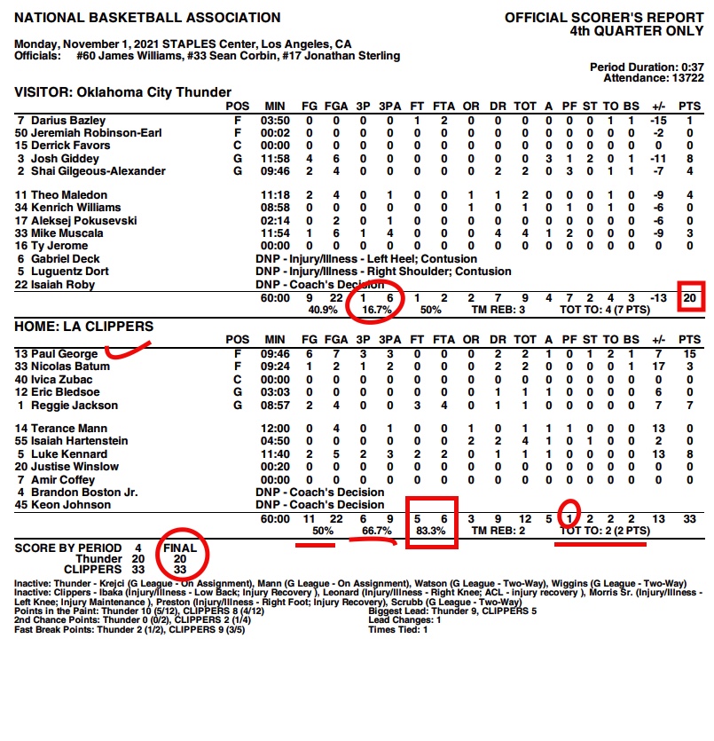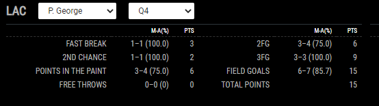 Paul George’s fourth quarter: 15 points, shot 6-7, 3-3 from 3 and added two rebounds, an assist, a steal and a block.