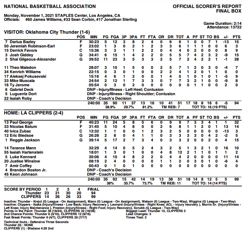 Final: Clippers 99, Thunder 94