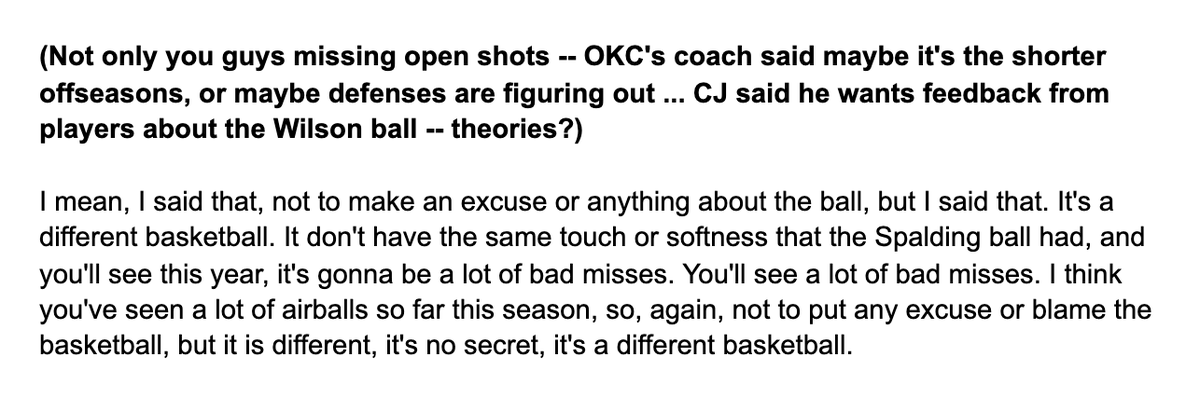 Asked Paul George about his theory behind the league-wide shooting drops and he said he didn’t want to use it as an excuse but the new Wilson basketball “is a different basketball. … It doesn’t have the same touch and softness that the Spalding ball had.” – 1:37 AM