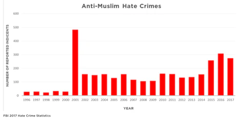 It's hard to tell just what the hell Krugman is talking about when he insists there was no "mass outbreak of anti-Muslim sentiment and violence." Indeed, anti-Muslim hate crimes skyrocketed following Sept. 11, 2001, and have remained in the stratosphere to this day, ticking upward even more in the years since Donald Trump was elected president.