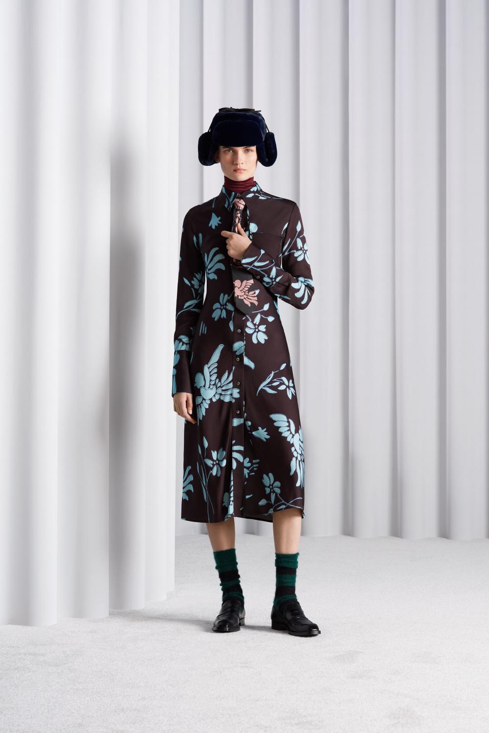 The palette of wintry greens, purples and browns are punctured by zesty highlights of lime, orange and pink. Floral prints create a sense of softness to sit in contrast with the utilitarian toughness of military jackets and heavy boots.