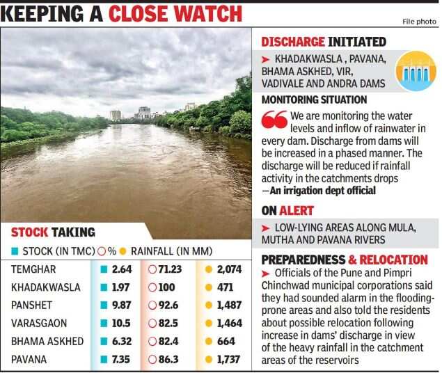 PUNE: The water storage in Panshet and Pavana dams increased to 90% on Thursday, prompting the state irrigation department to issue an alert in the low-lying areas along Mutha, Mula and Pavana rivers in Pune and Pimpri Chinchwad about a possible rise in the water levels in these rivers following discharge from the reservoirs.