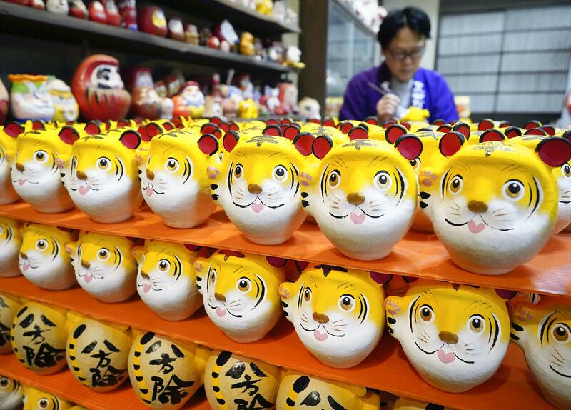 Tiger ornaments line the shelves of a daruma doll shop in Hiratsuka, Kanagawa Prefecture. The shop aims to make 3,000 ahead of the new year -- 2022 is the year of the tiger in the Chinese zodiac. Made of paper and clay, the 11 centimeter-tall tigers are modeled after maneki-neko cat ornaments, which are believed to bring luck. "I'm making them with great care in the hope that they help bring an end to the pandemic," the owner of the shop said.