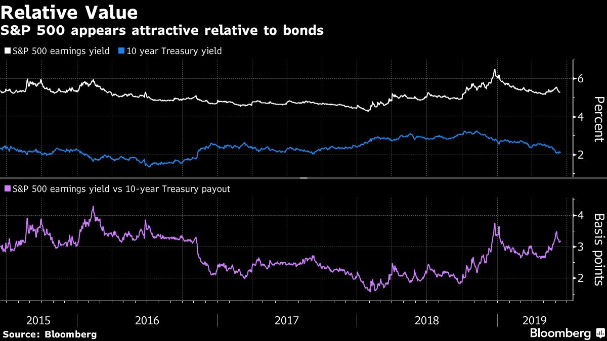 In effect, the handicappers are saying valuations will expand to make up for the lowered earnings targets, counting on an improvement in investor psychology that is encouraged by Federal Reserve rate cuts. At 16.5 times forecast profits, the S&P 500 trades in line with the average multiple in the past five years. But relative to Treasuries where 10-year yields sit near a two-year low, stock valuations can be framed as cheap.