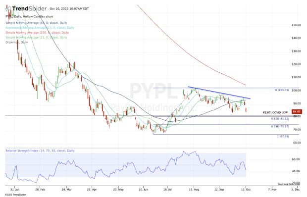 But if PayPal stock continues to pull back, we could be looking at a test of $81 to $82. That is the 61.8% retracement of the current rally from the June low. It’s also where the covid low of $82.07 comes into play.