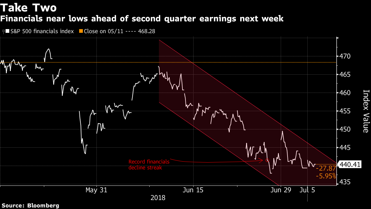 Banking stocks are "cheap" with balance sheets in better shape than at any other point in at least three decades, Oppenheimer analysts led by Chris Kotowski wrote earlier this week in a preview for earnings. Kotowski sees earnings growth in the sector as likely to grow faster than the overall market. Financials remain down 5 percent on the year, and will also be subject to key inflation data next week, which includes CPI and import prices.