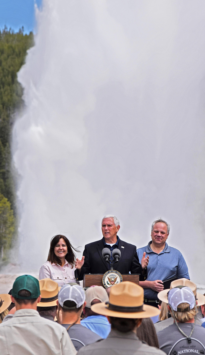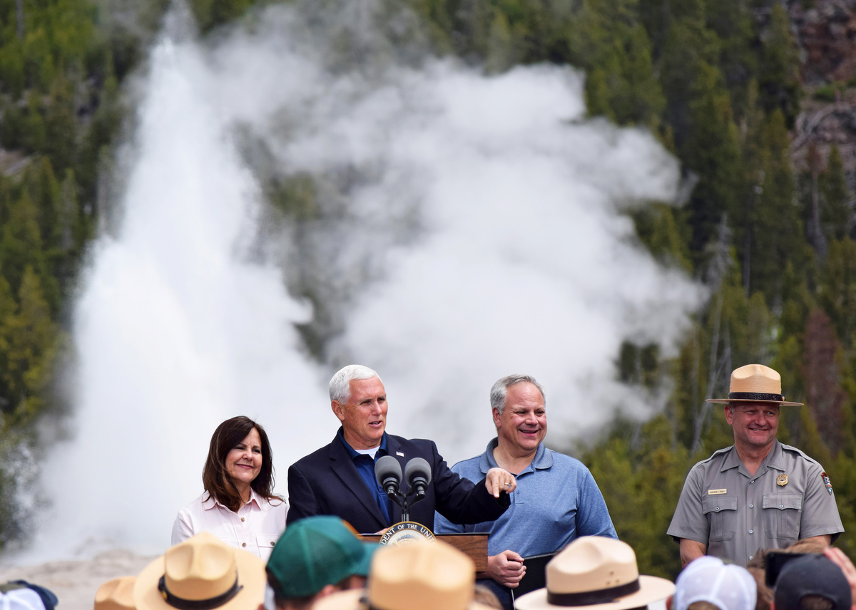 U.S. Interior Secretary David Bernhardt and Yellowstone National Park Superintendent Cam Sholly joined Pence for his appearance, carefully timed to coincide with one of the periodic eruptions of the Old Faithful Geyser, a major attraction in a park world renowned for its geothermal features and wildlife.