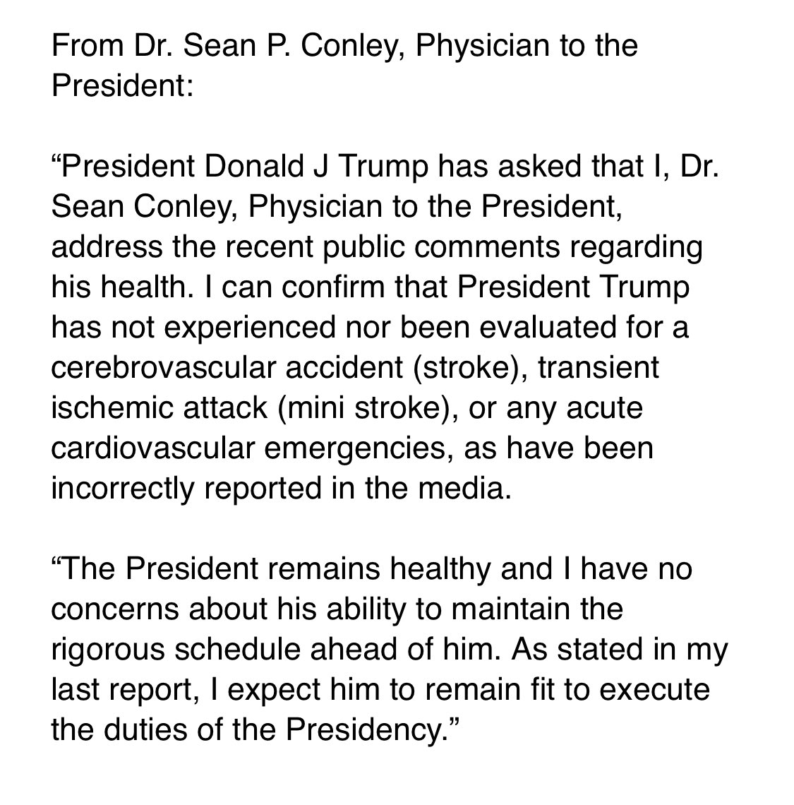 Dr Sean Conley, Trump’s physician, said in a statement the president had not “experienced nor been evaluated for a cerebrovascular accident (stroke), transient ischemic attack (mini stroke) or any acute cardiovascular emergencies”.