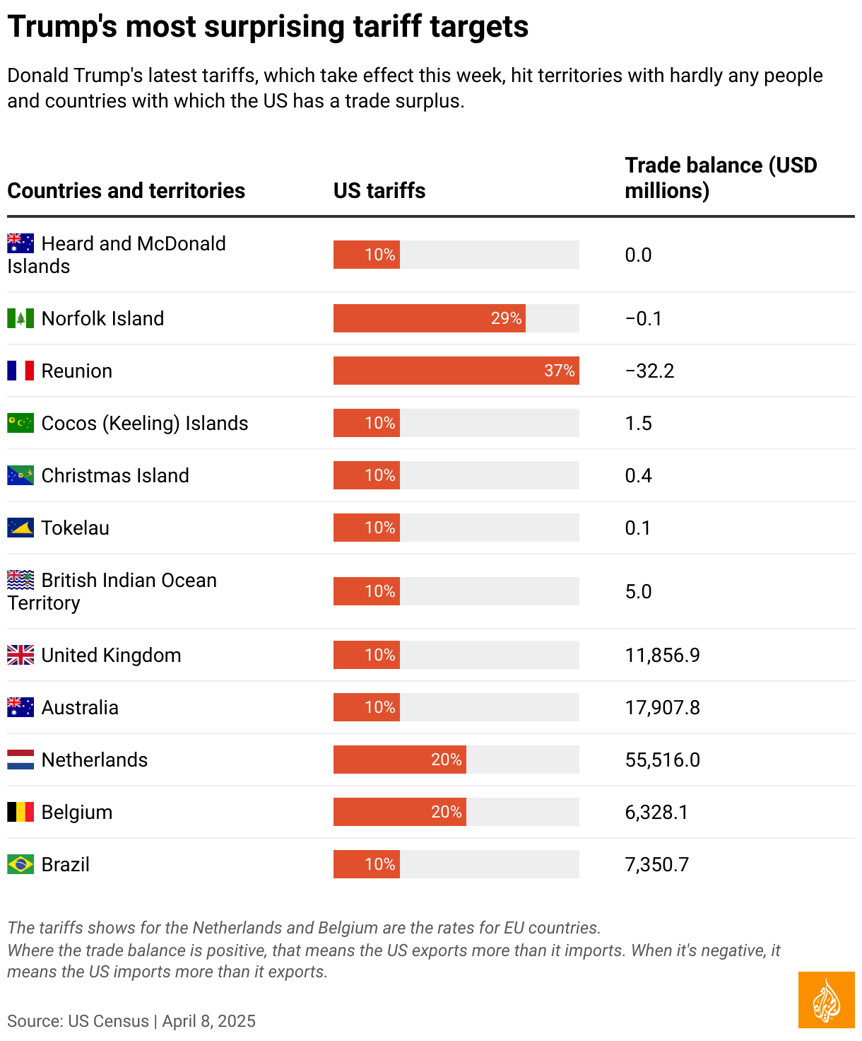 Like many of these small islands, large countries that the US has a trade surplus with too have been hit with tariffs — defying the formula used to justify levies.