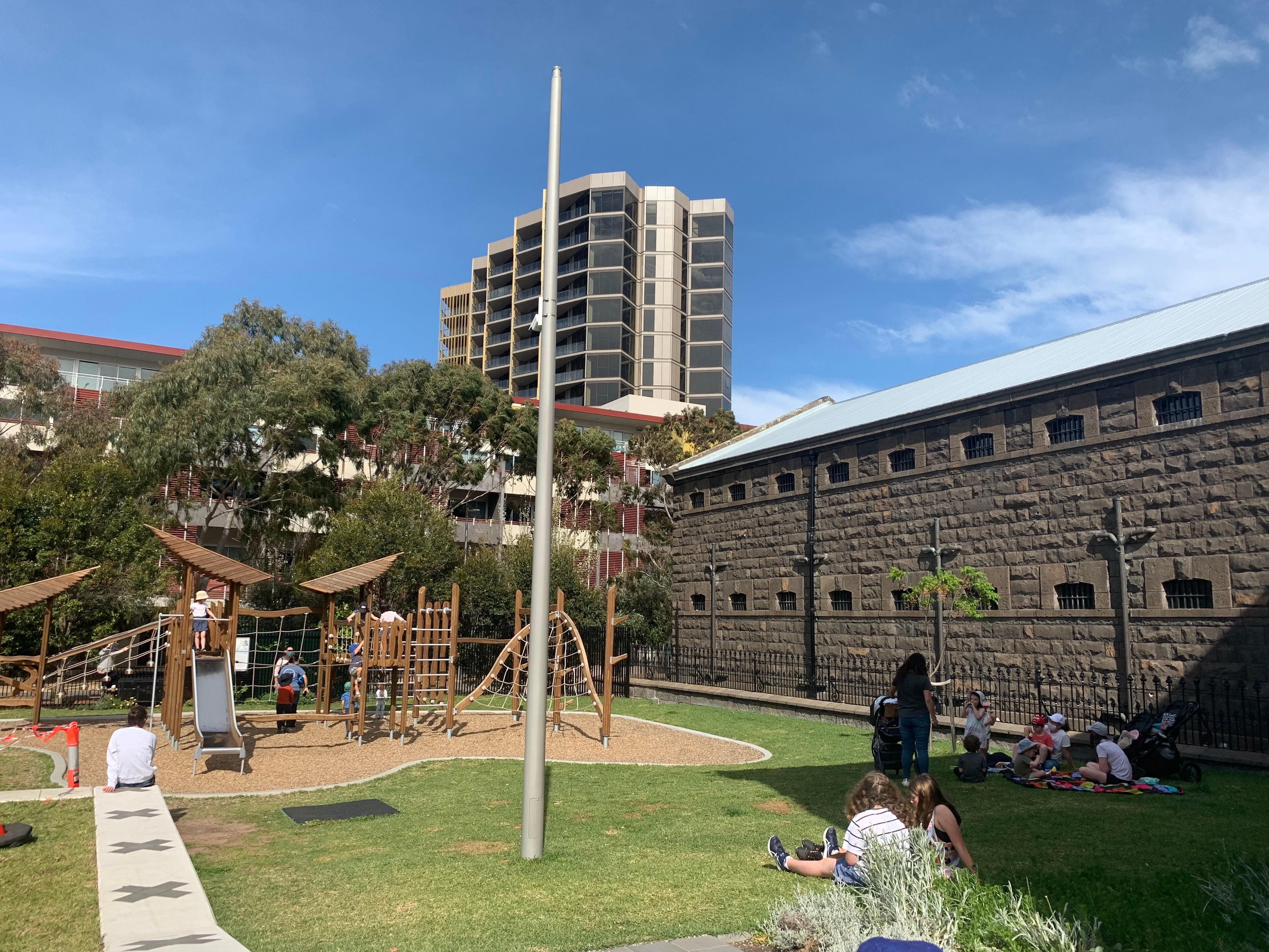 In what was the prison's muster yard, children can run free while their parents watch on enjoying a coffee or gelato.
