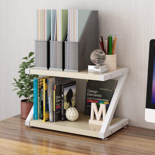 A compact shelf that adds storage to desks