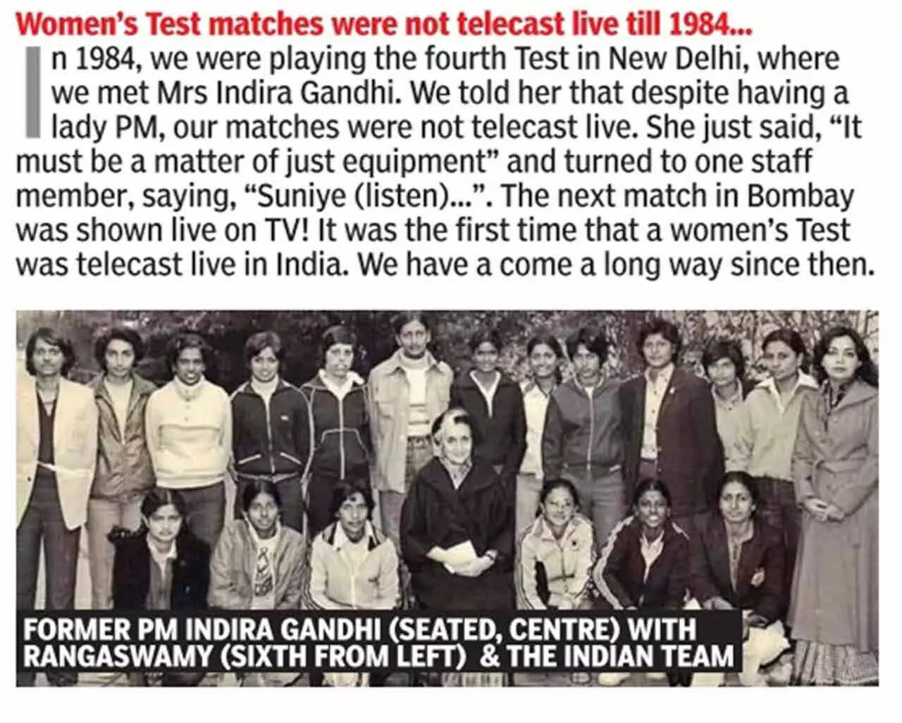 In 1984, we were playing the fourth Test in New Delhi, where we met Mrs Indira Gandhi. We told her that despite having a lady PM, our matches were not telecast live. She just said, "It must be a matter of just equipment" and turned to one staff member, saying, "Suniye (listen). . . ". The next match in Bombay was shown live on TV! It was the first time that a women's Test was telecast live in India. We have a come a long way since then.