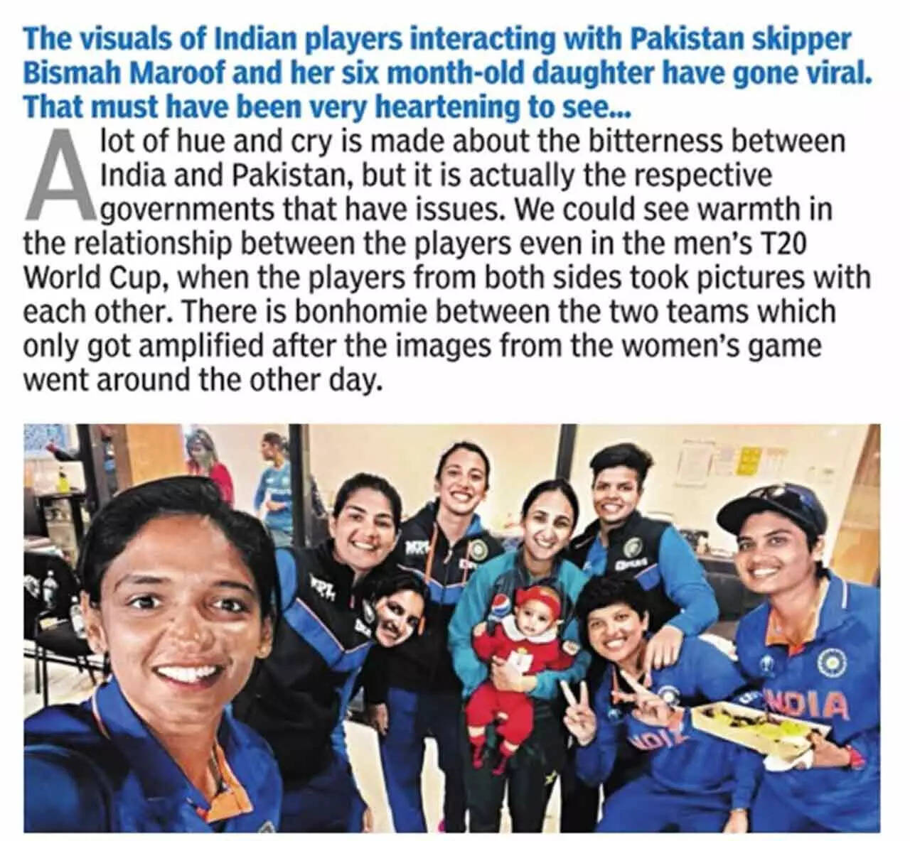 A lot of hue and cry is made about the bitterness between India and Pakistan, but it is actually the respective governments that have issues. We could see warmth in the relationship between the players even in the men's T20 World Cup, when the players from both sides took pictures with each other. There is bonhomie between the two teams which only got amplified after the images from the women's game went around the other day.