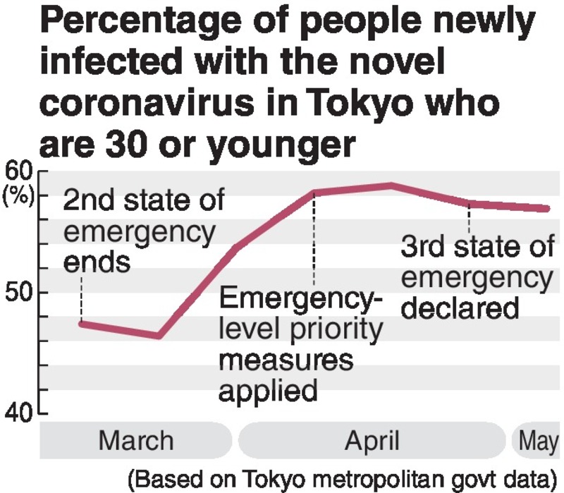 In Tokyo, people in their 30s or younger accounted for less than 50% of new infections from late January to March this year, but the percentage exceeded 50% in April, rising to 59% from April 13-19, and has remained high in May.