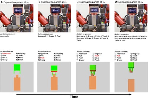 To explain its actions, the robot can draw on its internal decision process as well as its behavior. The symbolic model provides step-by-step descriptions of the robot’s actions, and the haptic model provides a sense of what the robot gripper is “feeling.”