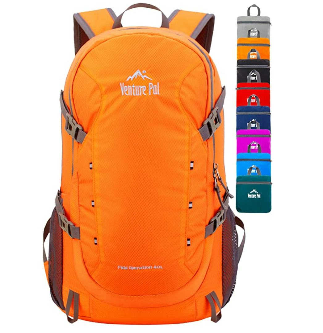 This large, 40-liter backpack folds up small enough to fit into a pouch you will hardly notice in your luggage or a closet. But when you open it up, it’s full featured with water bottle pockets on the sides, several pockets inside — including a zippered safety pocket and a waterproof pouch for wet gear — and a chest strap to better distribute the weight.