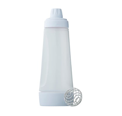 Toss all your ingredients into the wide mouth at the bottom of this batter bottle, add the whisk ball, and shake. The batter mixes up super fluffy and all you have to do is squirt your pancakes into the pan from the silicone tip at the other end. Your pancakes will be done super fast and the cleanup is super easy.