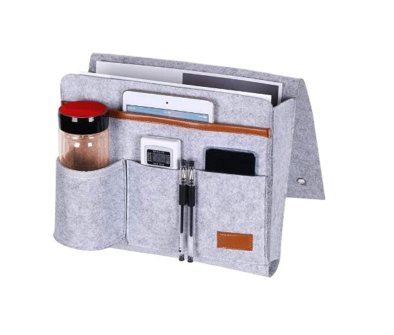 Slide the flap under your mattress or over the arm of a chair and drop your phone and water bottle into the pockets of this clever storage caddy. There are small pockets for phones and remotes, a tablet sleeve, and a large compartment for files or reading material.