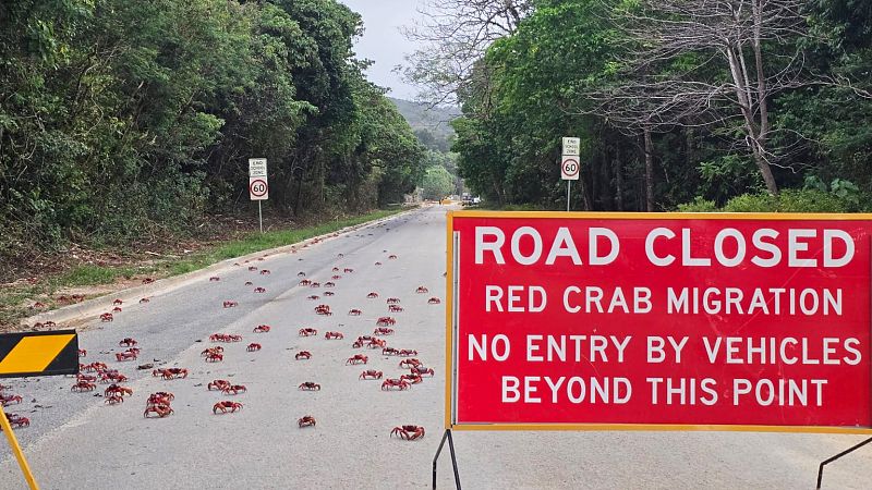 Tens of millions of red crabs are making their way to the ocean as part of their annual migration on Christmas Island, where a much smaller human population uses leaf blowers and garden rakes to help them on their way.