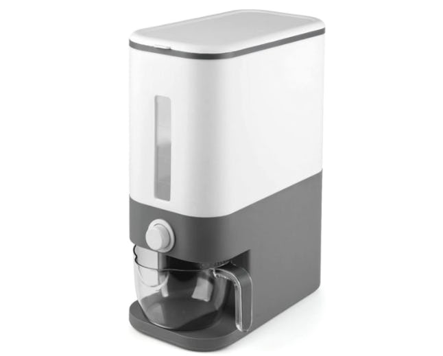 If you buy your rice in big bags, this clever container will store it, dispense it, and display it nicely on a counter. Just push the button and it delivers rice — or other grains or cereal — into the cup below, with accompanying scale. A window shows you how much rice you have, and it holds up to 25 pounds.