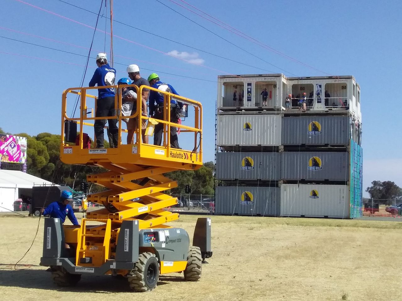 To get him up onto the flying fox, a team used special equipment including a hoist, shackles and a scissor lift.
