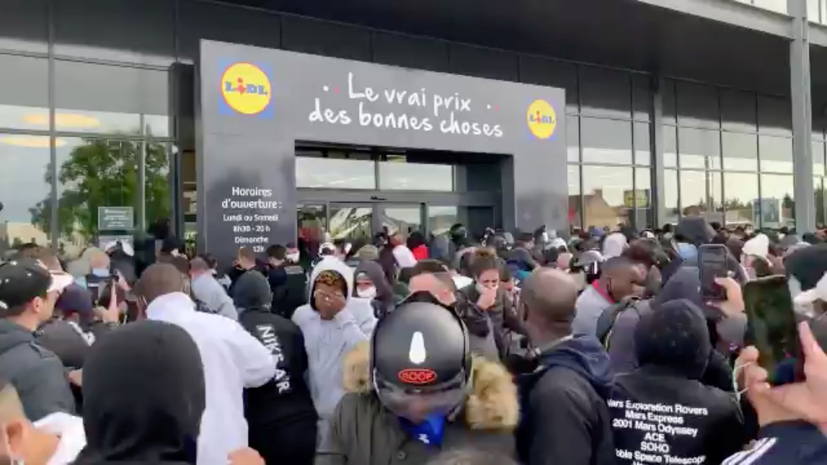 People who gathered outside a Lidl store react after pepper spray was used as the store is due to sell the PlayStation 4 for 95 Euros, in Orgeval, France June 17, 2020 in this still image obtained from a social media video. EDITIONS DAUVERS/via REUTERS People sit outside a Lidl store as it is due to sell the PlayStation 4 for 95 Euros, in Orgeval, France June 17, 2020 in this still image obtained from social media video. EDITIONS DAUVERS/via REUTERS