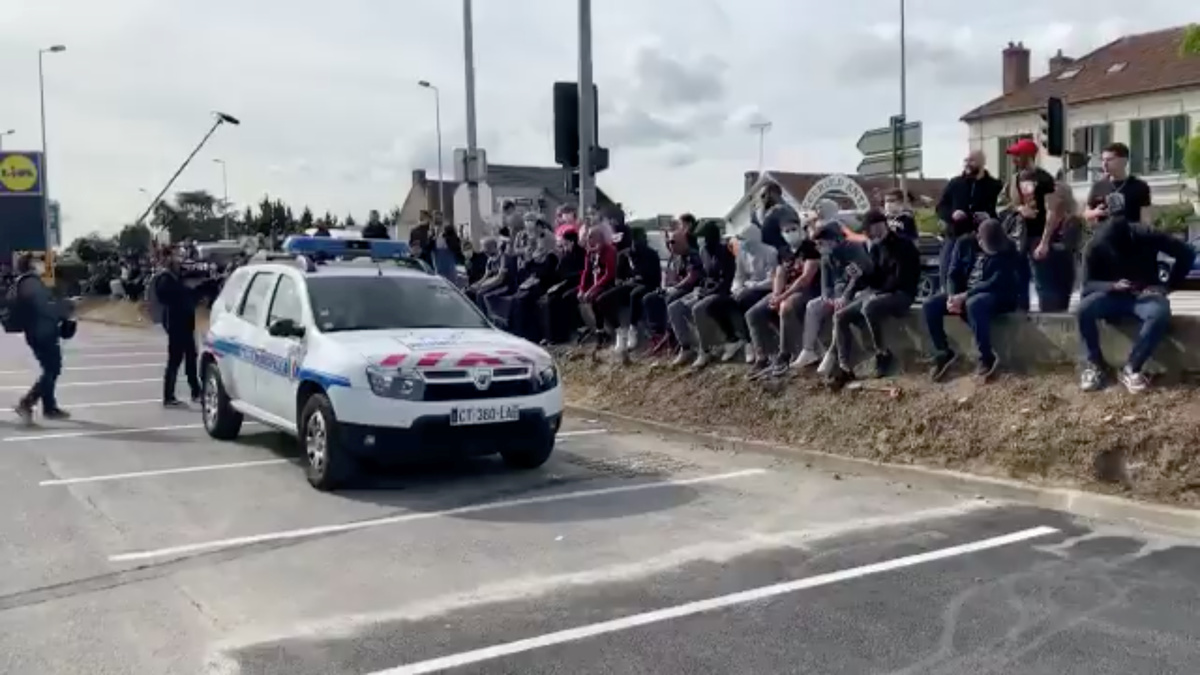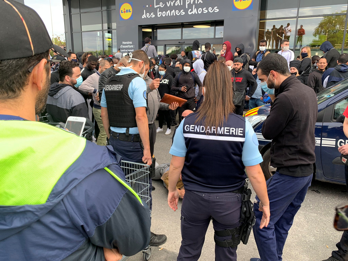 Members of the national Gendarmerie are seen as people gather outside a Lidl store as it is due to sell the PlayStation 4 for 95 Euros, in Orgeval, France June 17, 2020 in this picture obtained from social media. EDITIONS DAUVERS/via REUTERS