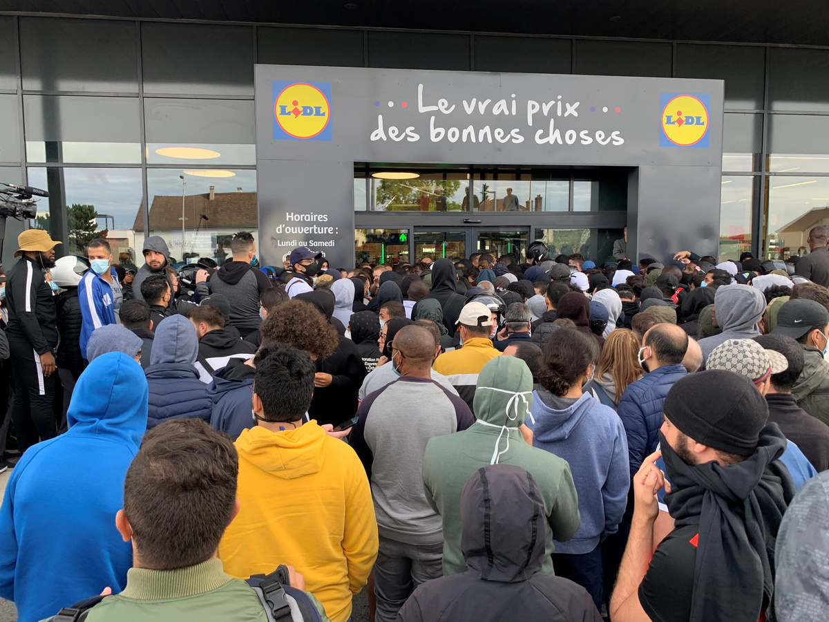 People gather outside a Lidl store as it is due to sell the PlayStation 4 for 95 Euros, in Orgeval, France June 17, 2020 in this picture obtained from social media. EDITIONS DAUVERS/via REUTERS
