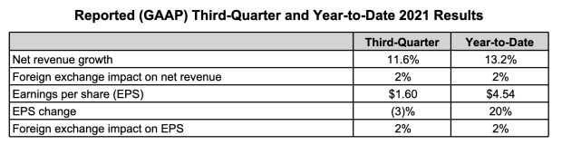“We are pleased with our results for the third quarter as we delivered very strong net revenue growth while carefully navigating a dynamic and volatile supply chain and cost environment. Given our year-to-date performance, we now expect our full-year organic revenue to increase approximately 8% and core constant currency earnings per share to increase at least 11%,” said CEO Ramon Laguarta in the company's Q3 earnings release.