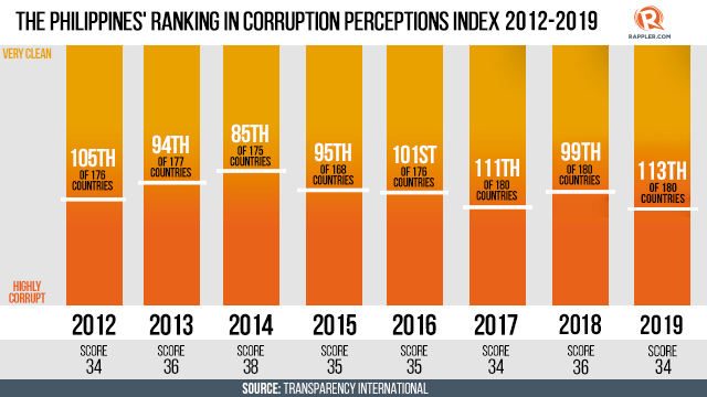 MANILA, Philippines – The Philippines fared worse in the 2019 Corruption Perceptions Index (CPI) of Transparency International versus 2018.