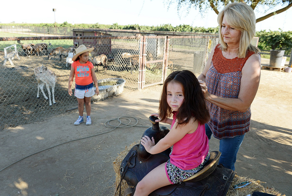 Hairdresser Kelly Muzio had a solution: Make a barber's chair out of a saddle on a bale of hay, and put it outside on her farm west of Fresno overlooking a pen filled with goats, chickens, ostriches and sheep.