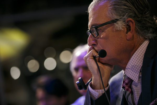 There's an orange X on the floor marking his spot for appearing on air, with a remote-control camera perched in the corner of the room. Most of the time, it's just his voice and a picture of him that shows up during a game, but occasionally he will get up from his swivel chair, sit on the corner of his desk, and deliver a pithy, 20-second monologue on live TV.