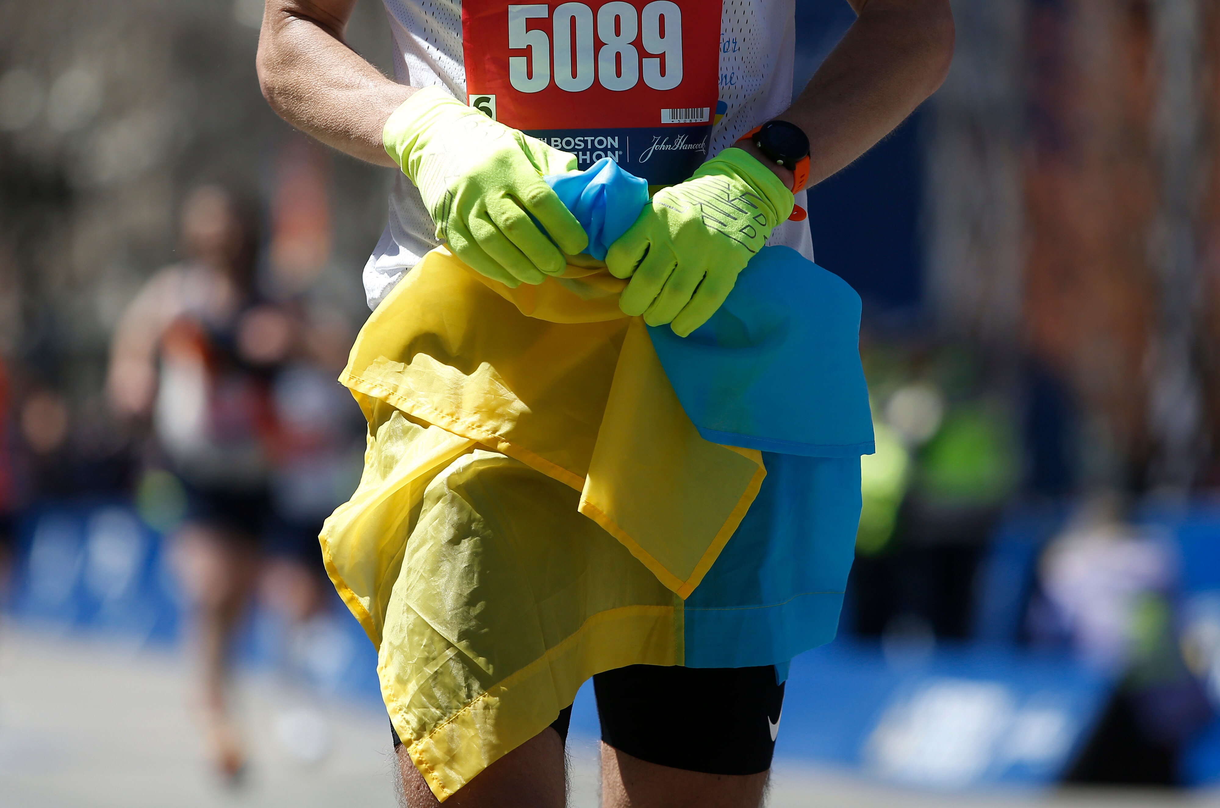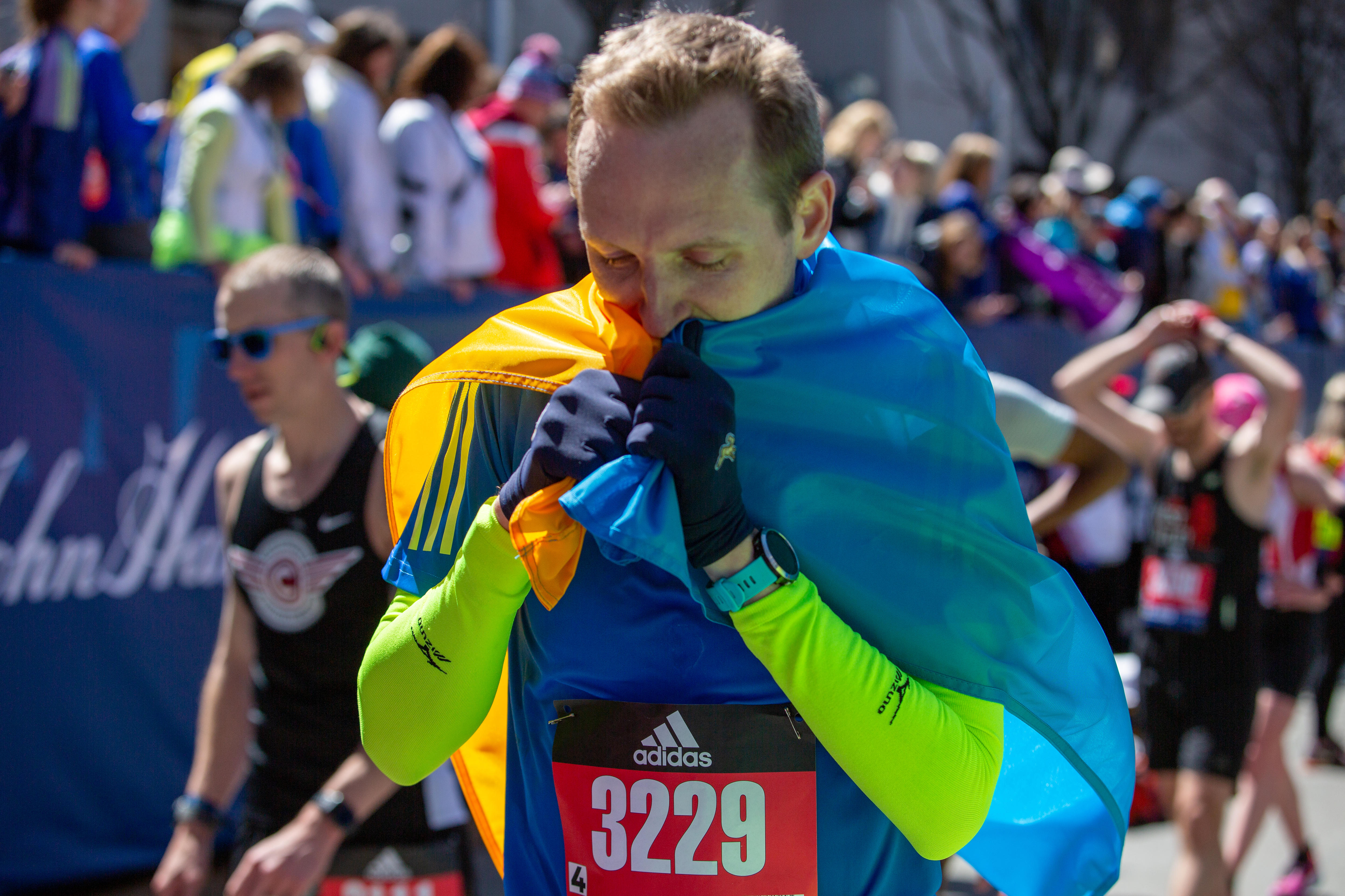 Fans waved Ukrainian flags in support of the runners whose 26.2-mile run Monday was the easiest part of their journey.