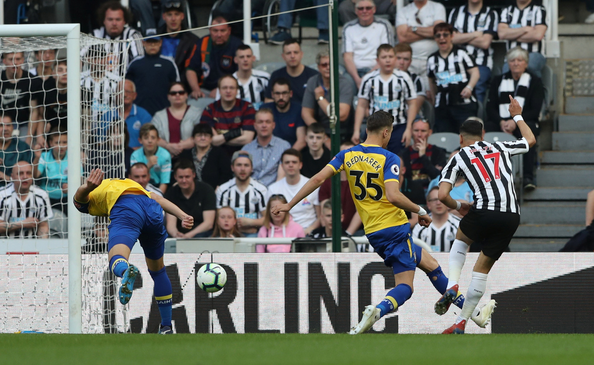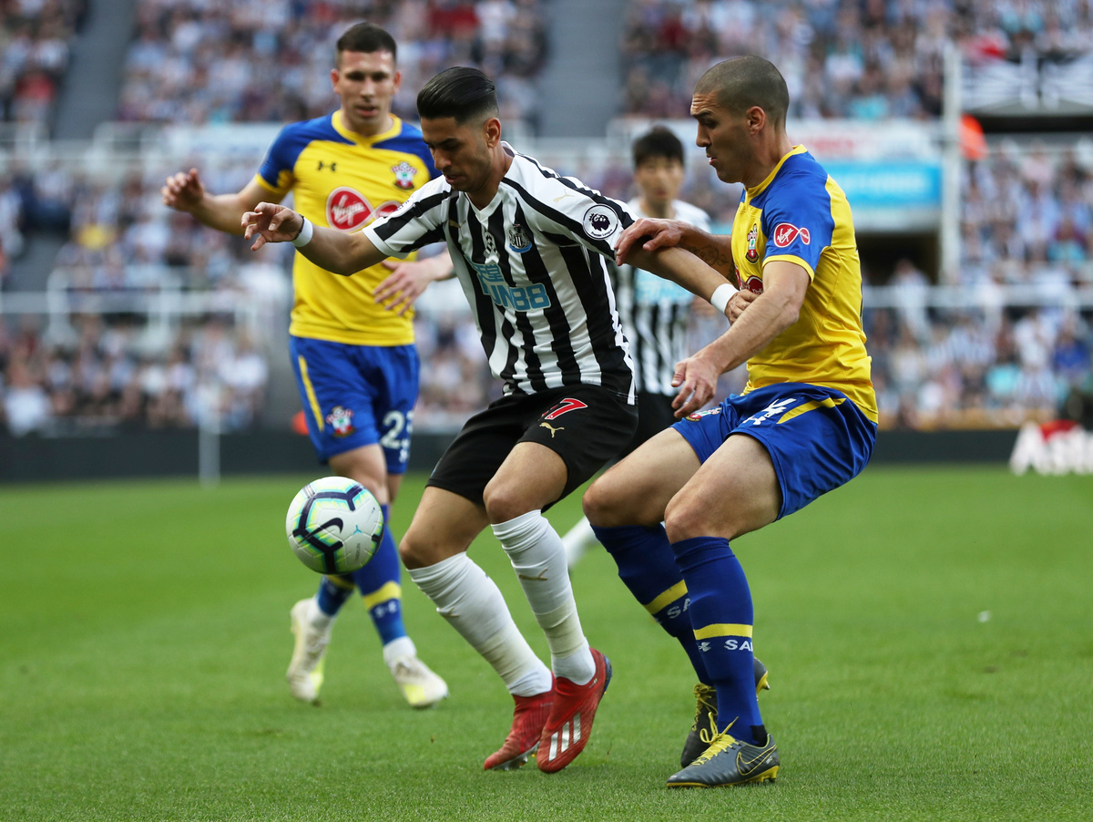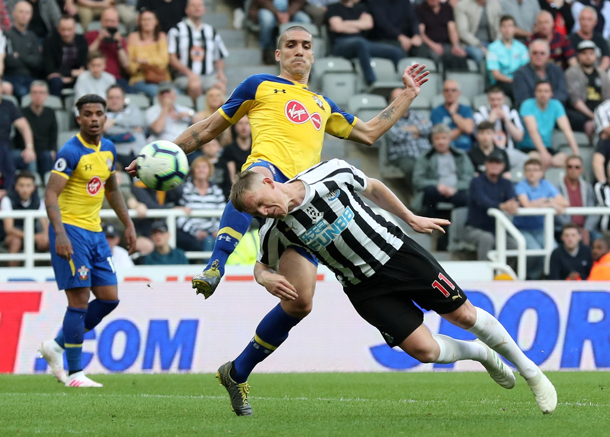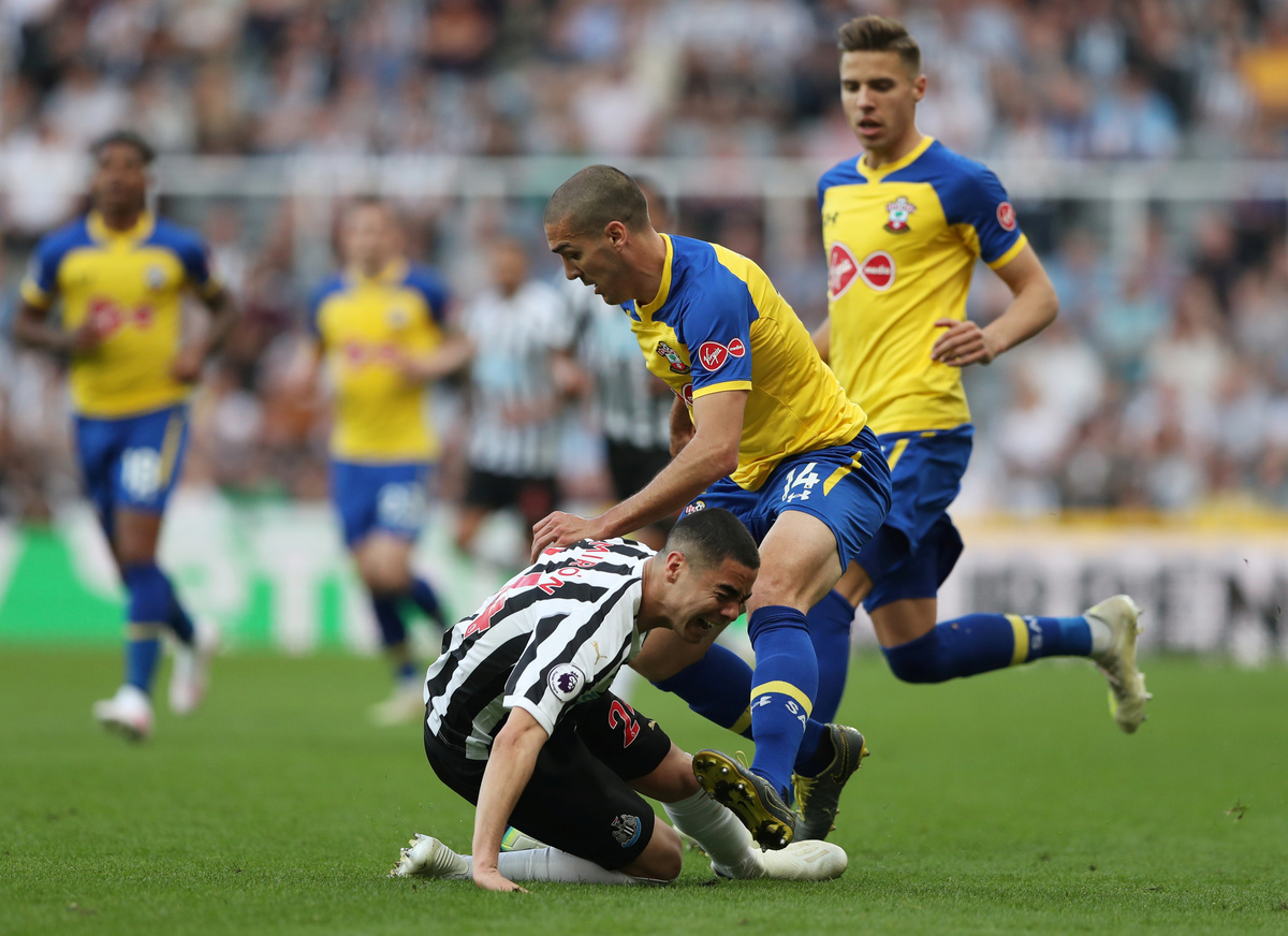 Soccer Football - Premier League - Newcastle United v Southampton - St James' Park, Newcastle, Britain - April 20, 2019 Newcastle United's Isaac Hayden in action with Southampton's Pierre-Emile Hojbjerg REUTERS/Scott Heppell Soccer Football - Premier League - Newcastle United v Southampton - St James' Park, Newcastle, Britain - April 20, 2019 Newcastle United's Ayoze Perez in action with Southampton's Oriol Romeu Action Images via Reuters/Lee SmithSoccer Football - Premier League - Newcastle United v Southampton - St James' Park, Newcastle, Britain - April 20, 2019 Newcastle United's Matt Ritchie in action with Southampton's Oriol Romeu REUTERS/Scott HeppellSoccer Football - Premier League - Newcastle United v Southampton - St James' Park, Newcastle, Britain - April 20, 2019 Southampton's Mario Lemina scores their first goal Action Images via Reuters/Lee SmithSoccer Football - Premier League - Newcastle United v Southampton - St James' Park, Newcastle, Britain - April 20, 2019 Newcastle United's Miguel Almiron in action with Southampton's Oriol Romeu REUTERS/Scott HeppellSoccer Football - Premier League - Newcastle United v Southampton - St James' Park, Newcastle, Britain - April 20, 2019 Newcastle United's Ayoze Perez celebrates scoring their third goal to complete his hat-trick with Salomon Rondon, Matt Ritchie and team mates REUTERS/Scott HeppellSoccer Football - Premier League - Newcastle United v Southampton - St James' Park, Newcastle, Britain - April 20, 2019 Newcastle United's Ayoze Perez celebrates after the match with the match ball with referee Anthony Taylor REUTERS/Scott Heppell
