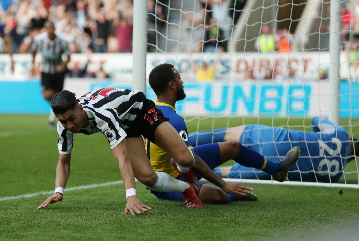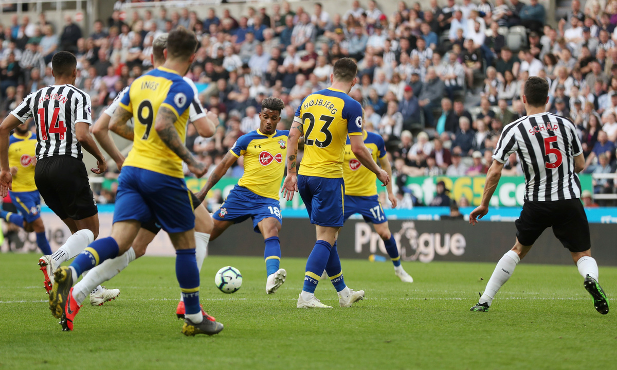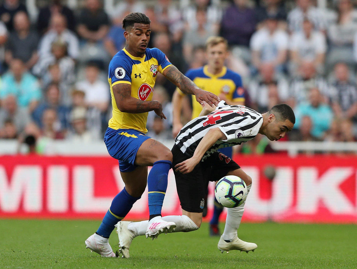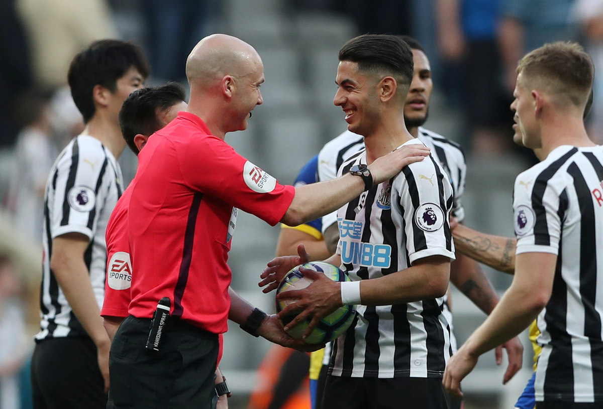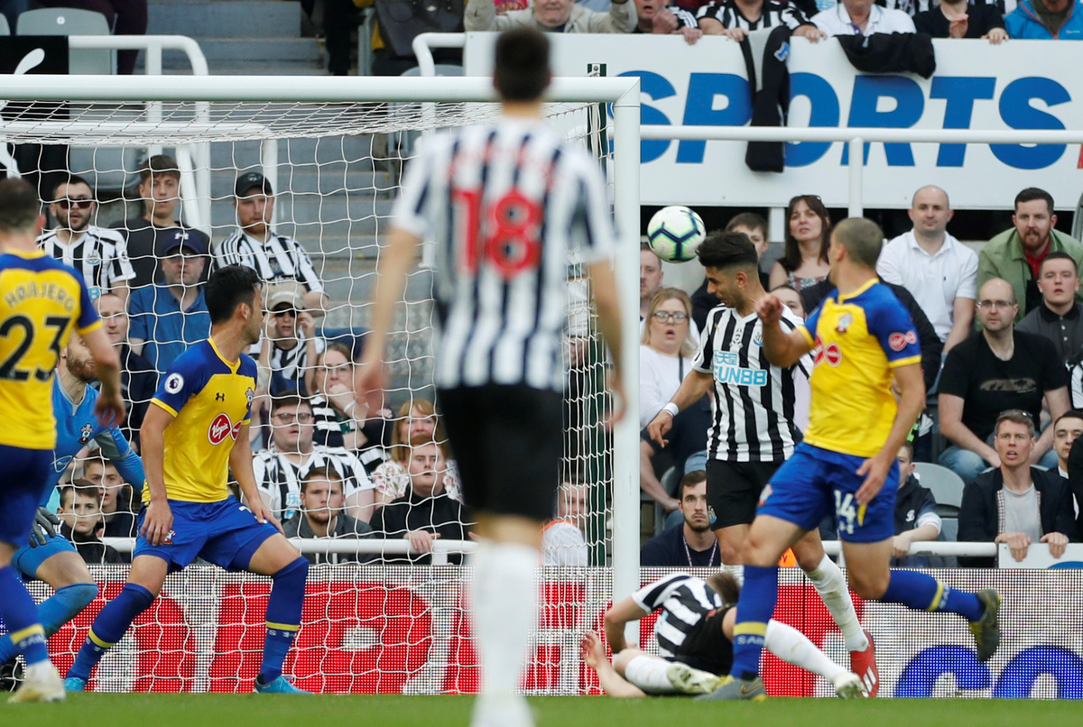 Soccer Football - Premier League - Newcastle United v Southampton - St James' Park, Newcastle, Britain - April 20, 2019 Newcastle United's Isaac Hayden in action with Southampton's Pierre-Emile Hojbjerg REUTERS/Scott Heppell Soccer Football - Premier League - Newcastle United v Southampton - St James' Park, Newcastle, Britain - April 20, 2019 Newcastle United's Ayoze Perez in action with Southampton's Oriol Romeu Action Images via Reuters/Lee SmithSoccer Football - Premier League - Newcastle United v Southampton - St James' Park, Newcastle, Britain - April 20, 2019 Newcastle United's Matt Ritchie in action with Southampton's Oriol Romeu REUTERS/Scott HeppellSoccer Football - Premier League - Newcastle United v Southampton - St James' Park, Newcastle, Britain - April 20, 2019 Southampton's Mario Lemina scores their first goal Action Images via Reuters/Lee SmithSoccer Football - Premier League - Newcastle United v Southampton - St James' Park, Newcastle, Britain - April 20, 2019 Newcastle United's Miguel Almiron in action with Southampton's Oriol Romeu REUTERS/Scott HeppellSoccer Football - Premier League - Newcastle United v Southampton - St James' Park, Newcastle, Britain - April 20, 2019 Newcastle United's Ayoze Perez celebrates scoring their third goal to complete his hat-trick with Salomon Rondon, Matt Ritchie and team mates REUTERS/Scott HeppellSoccer Football - Premier League - Newcastle United v Southampton - St James' Park, Newcastle, Britain - April 20, 2019 Newcastle United's Ayoze Perez celebrates after the match with the match ball with referee Anthony Taylor REUTERS/Scott Heppell