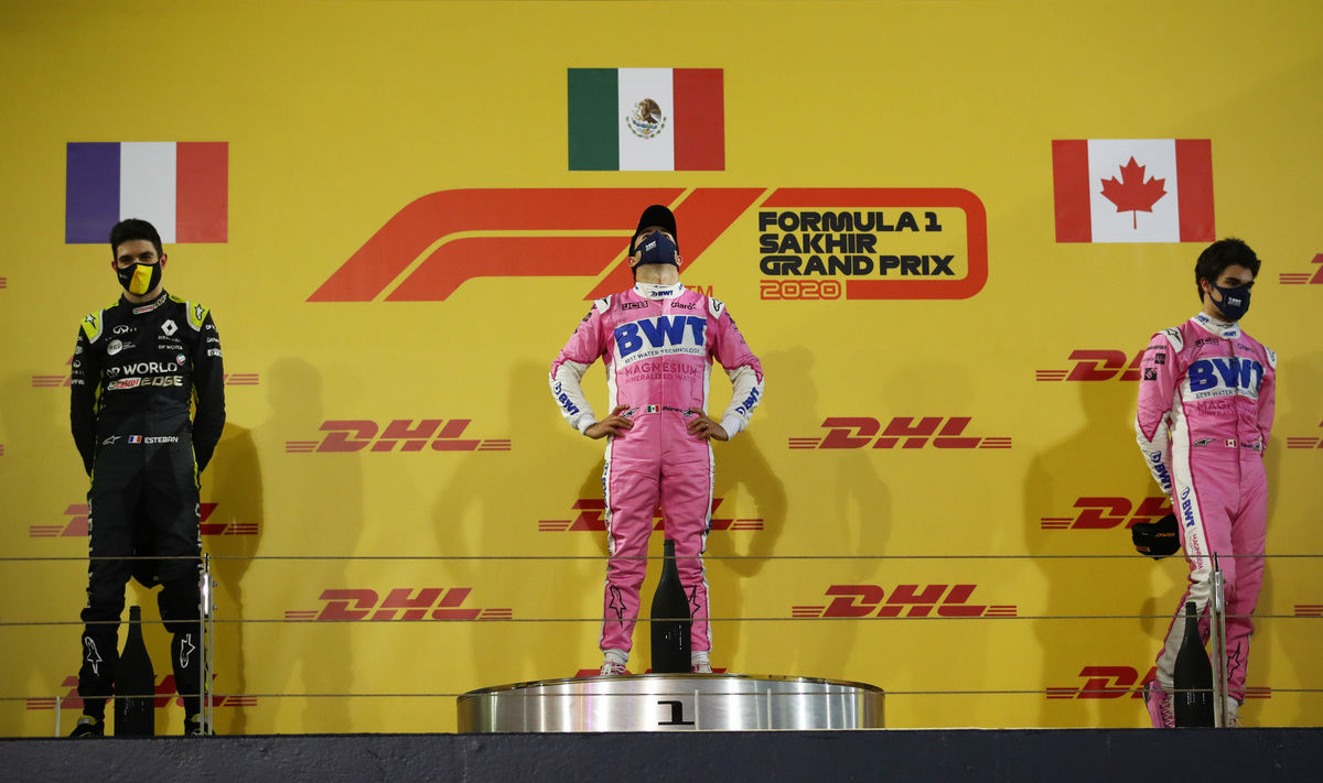 The Mexican's team mate Lance Stroll was third giving the podium an unfamiliar feel.