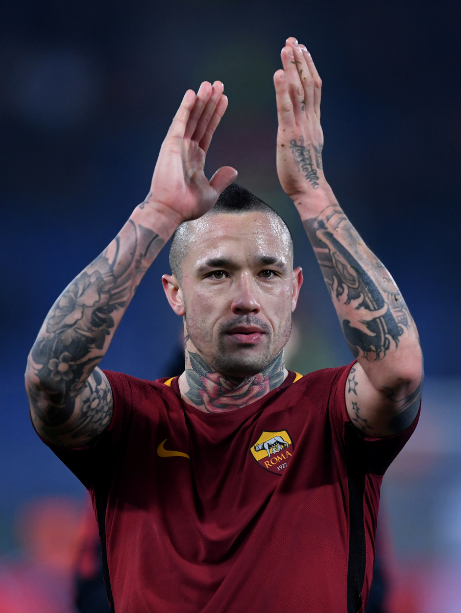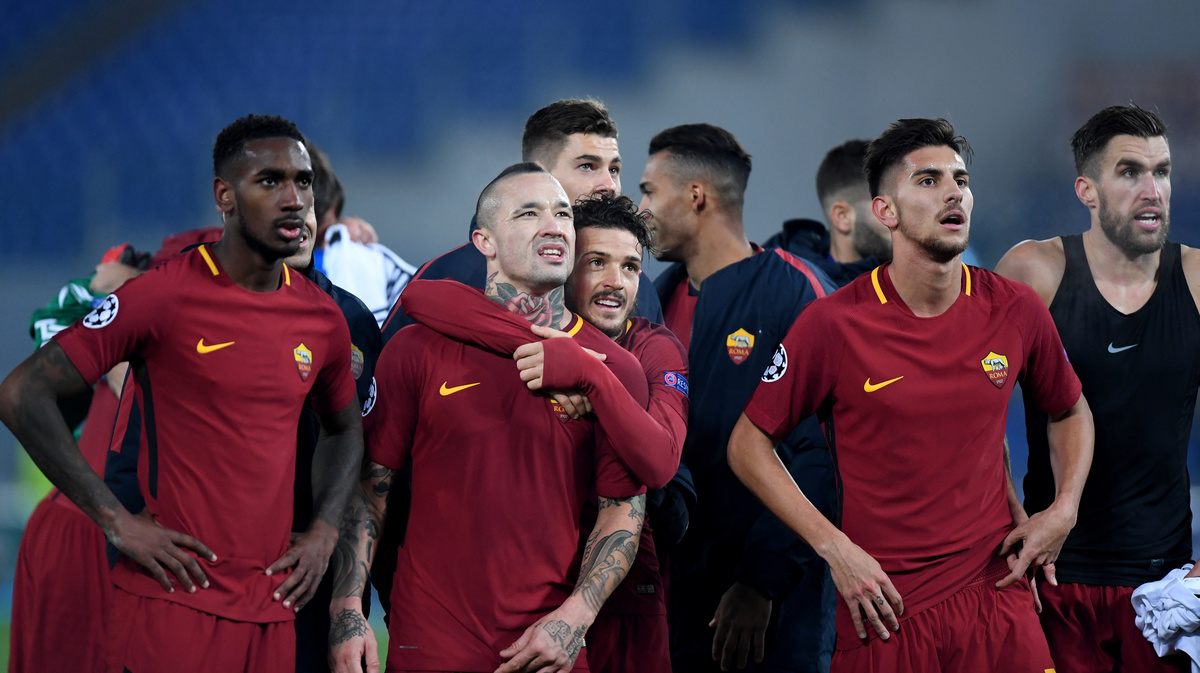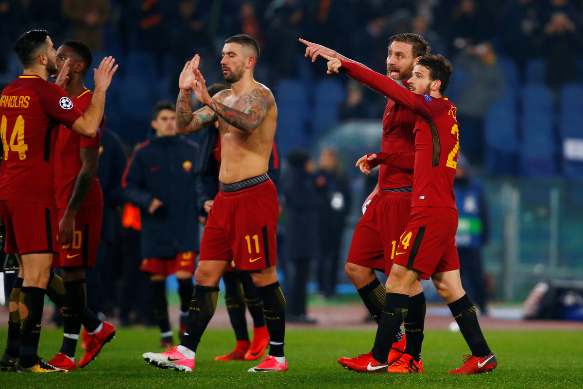 Soccer Football - Champions League - Roma vs Qarabag - Stadio Olimpico, Rome, Italy - December 5, 2017 Roma players celebrate after the match REUTERS/Alberto LingriaSoccer Football - Champions League - Roma vs Qarabag - Stadio Olimpico, Rome, Italy - December 5, 2017 Roma's Daniele De Rossi and Alessandro Florenzi after the match REUTERS/Tony GentileSoccer Football - Champions League - Roma vs Qarabag - Stadio Olimpico, Rome, Italy - December 5, 2017 Roma's Radja Nainggolan applauds the fans after the match REUTERS/Alberto Lingria