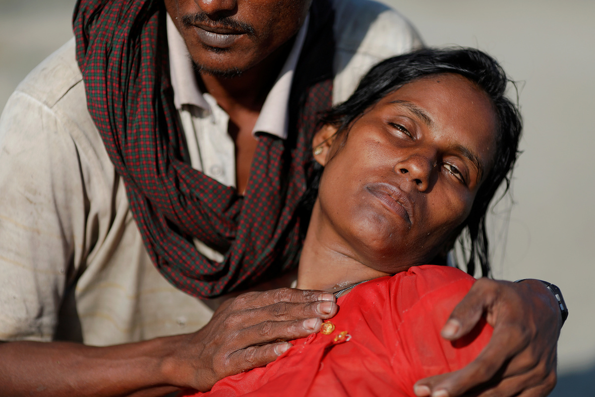 A woman carries her ill child in a refugee camp at Cox's Bazar, Bangladesh, September 26, 2017. Reuters photographer Cathal McNaughton: "She had been waiting since sunrise on aid to arrive. The temperature and humidity was pretty unbearable as there was no shelter. On top of this she was carrying her seriously ill child. Eventually she couldn't wait any longer, unprotected from the elements she made her way back to her shelter, empty handed." REUTERS/Cathal McNaughton